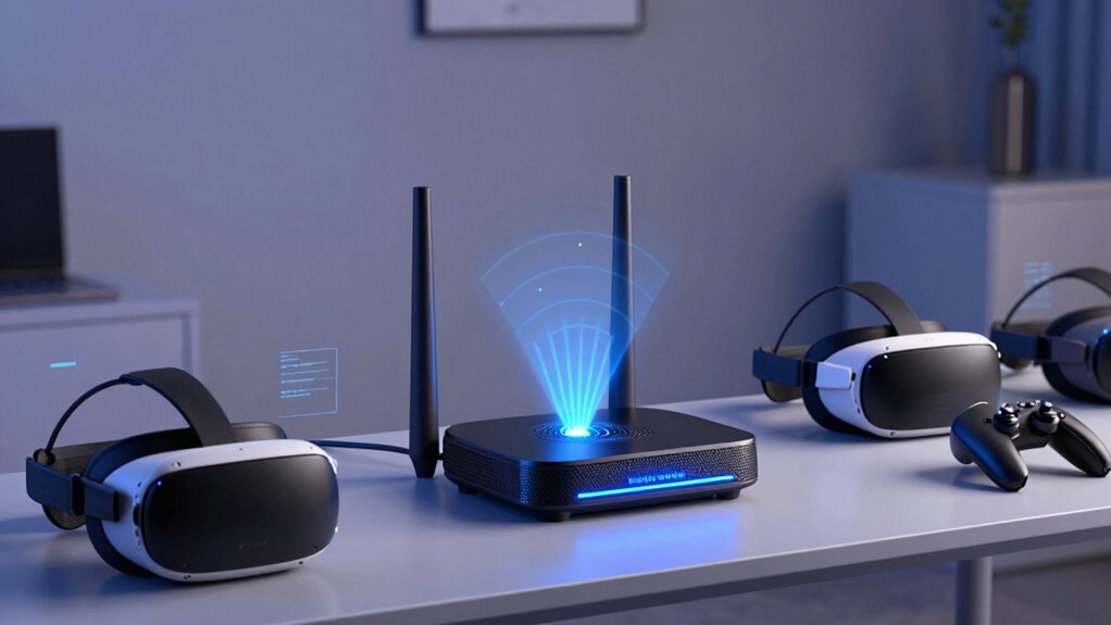 Like a well-coordinated symphony, mesh Wi-Fi systems can support multiple VR headsets simultaneously without missing a beat. They distribute bandwidth evenly, ensuring each device gets enough speed for smooth experiences. I’ve seen this work flawlessly, allowing friends or family to enjoy VR together without lag or disconnections. If you invest in a robust mesh system, you’ll find it handles multiple headsets seamlessly, elevating your shared virtual adventures.