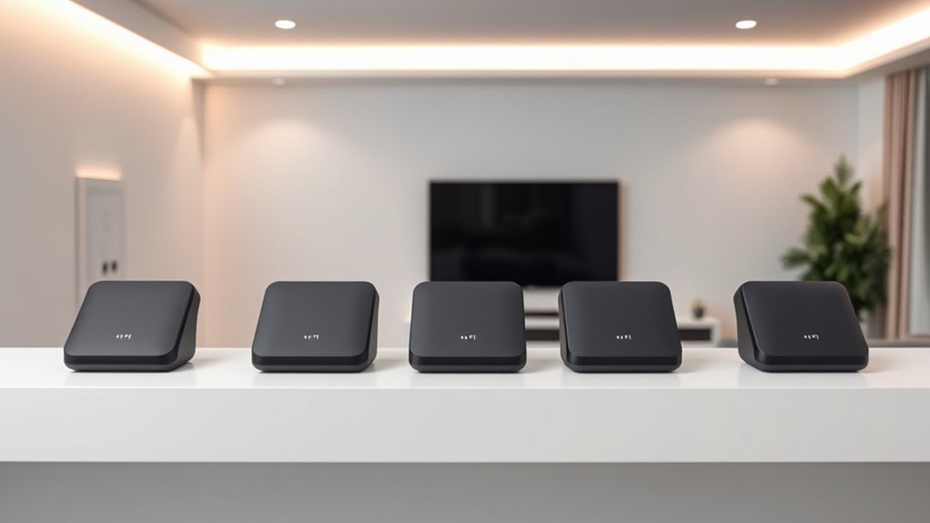 Choosing a future-proof mesh Wi-Fi system means prioritizing technologies that can adapt to rapid advancements and growing data needs. I look for systems that support the latest Wi-Fi standards like Wi-Fi 6, 6E, or 7, ensuring compatibility with emerging devices. Supporting multi-gigabit internet plans and high-speed wired backhaul options prepares my network for increasing bandwidth demands. Advanced features such as AI-driven mesh technology and seamless roaming help the system adjust to changing user behaviors and environments. Compatibility with various internet providers and backward compatibility with older Wi-Fi versions guarantee longevity. Regular firmware updates and security enhancements are essential to keep the system secure and current against evolving cyber threats. These factors ensure my network remains reliable and ready for future tech developments.