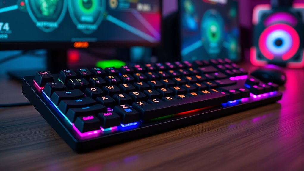 Selecting the right MMO gaming keypad involves more than just macro capacity; switch types play a significant role in overall performance and comfort. Mechanical switches, like Cherry MX or Blue switches, provide tactile feedback and durability, helping with precise macro activation. Optical switches use light-based actuation, offering faster response times and a longer lifespan than traditional mechanical switches. The actuation force needed varies, influencing response speed and user fatigue during long gaming sessions. Some keypads feature hot-swappable switches, so you can easily customize the feel without soldering, tailoring the device to your preferences. Switch sound profiles also matter—quieter options like Red or Brown switches reduce noise, while Blue switches produce audible clicks, which can impact your gaming environment. Choosing the right switch type enhances both performance and comfort.