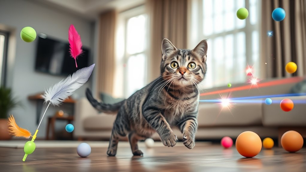 Absolutely, these toys are like a secret weapon against indoor boredom. I once watched my cat chase a moving light for hours, totally captivated. They stimulate your cat’s natural hunting instincts, keeping her engaged and active. With consistent play, these toys can markedly reduce boredom and even help curb destructive behaviors. They’re a fun, interactive way to keep your cat happy and mentally stimulated all day long.