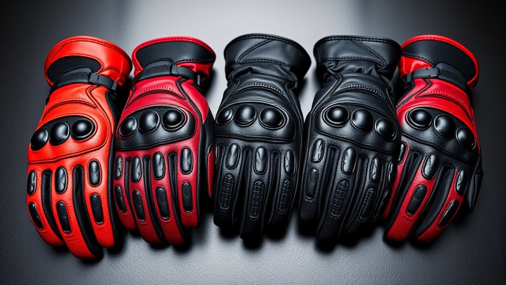 Glove materials considerably impact crash protection and abrasion resistance. I look for gloves made from durable materials like leather, textile blends with Kevlar, or reinforced synthetic fabrics, which absorb impact and resist tearing. These materials help protect my skin during falls and scrapes. I also check for reinforced palms and knuckles, as these add extra layers of defense, ensuring my hands stay safer in accidents.