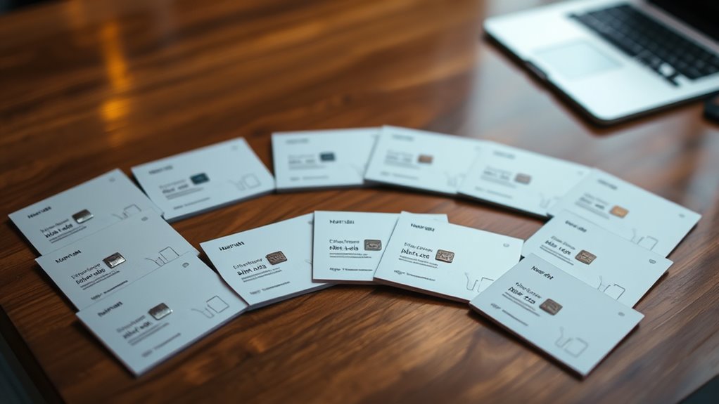 If you’re looking to boost your networking game, I recommend exploring the 13 best NFC business cards I’ve found. These options range from durable PVC designs to sleek stainless steel and feature customizable options like QR codes and logos. Many support rewritable data, secure encryption, and seamless sharing. Whether for professionals or businesses, these cards make a lasting impression. Keep going, and you’ll discover how to choose the perfect NFC card to elevate your connections.
