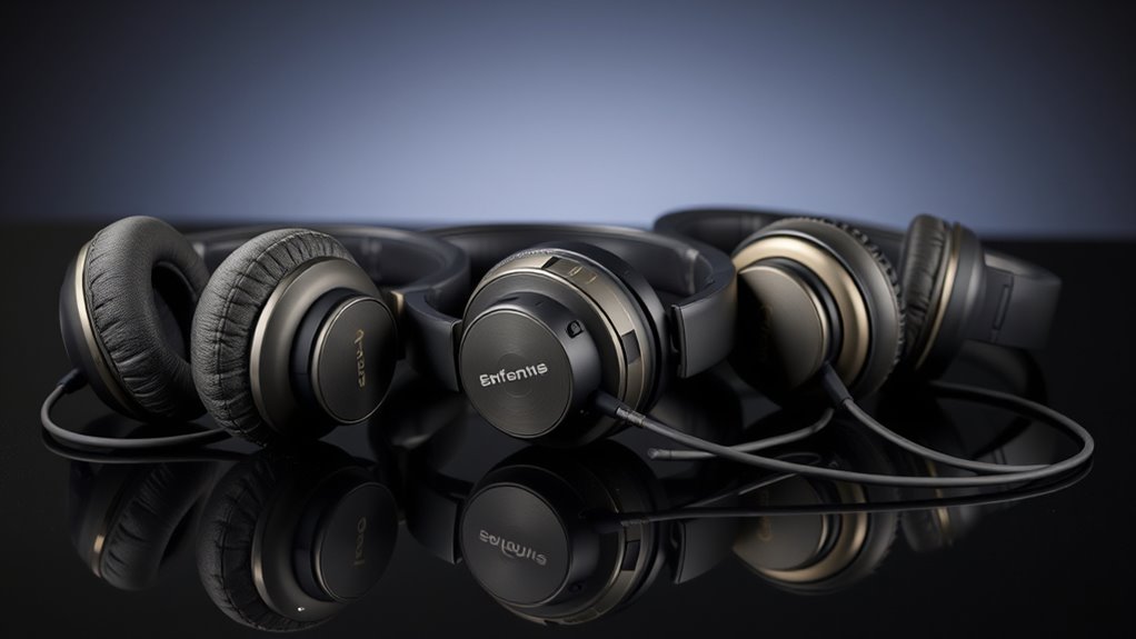 Ever wondered how much comfort impacts your listening experience? It’s essential, especially during long sessions. A comfortable fit prevents fatigue by evenly distributing pressure around your head and ears. Adjustable headbands and cushioned ear cups let you customize the fit to your head’s shape and size, making them much more comfortable. Lightweight headphones also reduce strain on your neck and shoulders, so you can wear them for hours without discomfort. Breathable ear cushions help prevent heat buildup and sweating, which can become distracting or uncomfortable over time. For the best noise-canceling experience, your headphones should seal securely around your ears without causing pressure or pain. Finding the right fit makes a significant difference in enjoying immersive sound without sacrificing comfort.