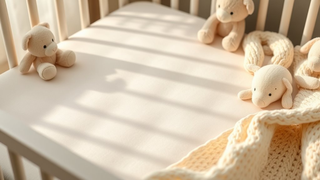 I recommend looking for sleep surfaces made from organic cotton, natural wool, or untreated latex. These materials are naturally free from harmful chemicals and off-gassing. I also consider certified organic fabrics or natural latex certified by reputable organizations. Avoid synthetic foams or vinyl covers. Choosing a mattress with these natural, non-toxic materials helps create a safe, healthy sleep environment for your baby, giving you peace of mind.