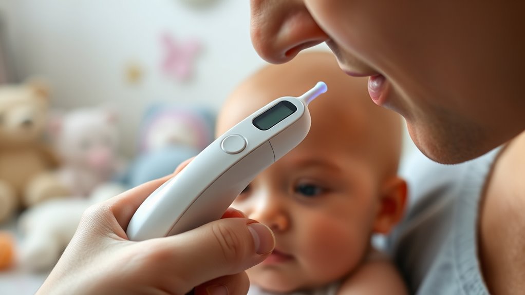 Think of it as a delicate dance—environmental factors can really throw off thermometer readings. Bright sunlight, drafts, or room temperature changes can lead to inaccurate results. I always make certain to keep the room at a comfortable, stable temperature and avoid direct sunlight or air vents when taking a baby’s temperature. This way, I ensure the readings are as accurate as possible for my little one’s safety.