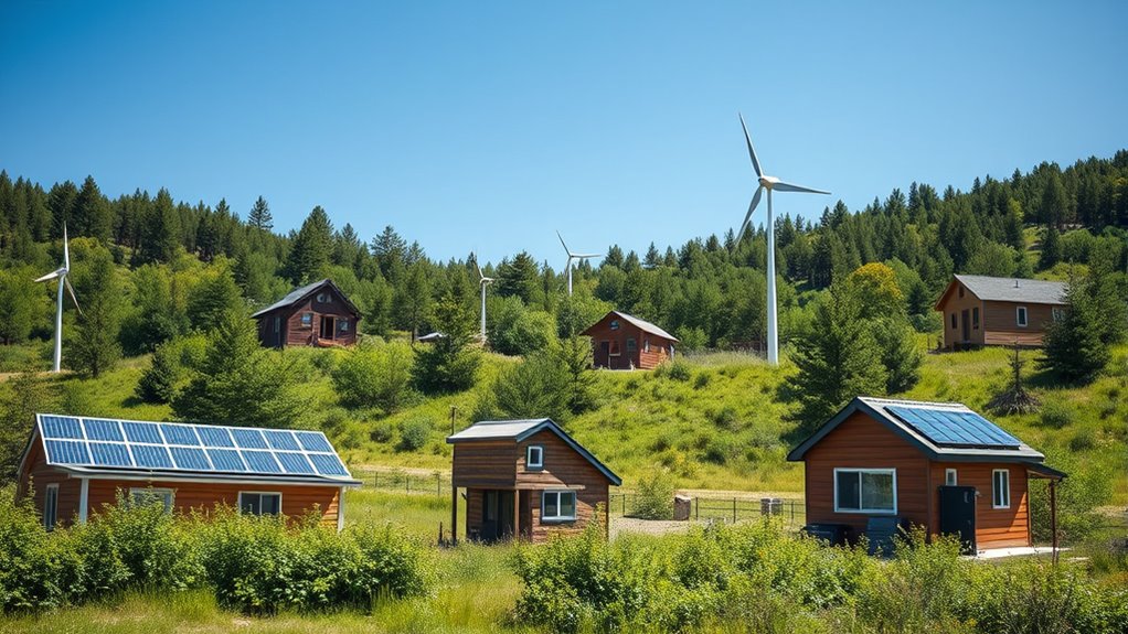 Selecting the right renewable energy sources for your tiny home depends on several key factors. Solar panels are the most common choice, especially high-efficiency bifacial panels that reach up to 25.2% efficiency, maximizing energy production in limited space. If you live in a windy area, wind turbines can supplement solar, providing power during cloudy days or at night. For locations near flowing water, micro-hydro systems are a reliable, consistent source with minimal environmental impact. It’s also vital to take into account energy storage; lithium-ion or LiFePO4 batteries store excess energy for use during low sunlight or wind. Finally, integrating these sources with smart energy management systems guarantees ideal power usage, making your tiny home truly sustainable and self-sufficient.
