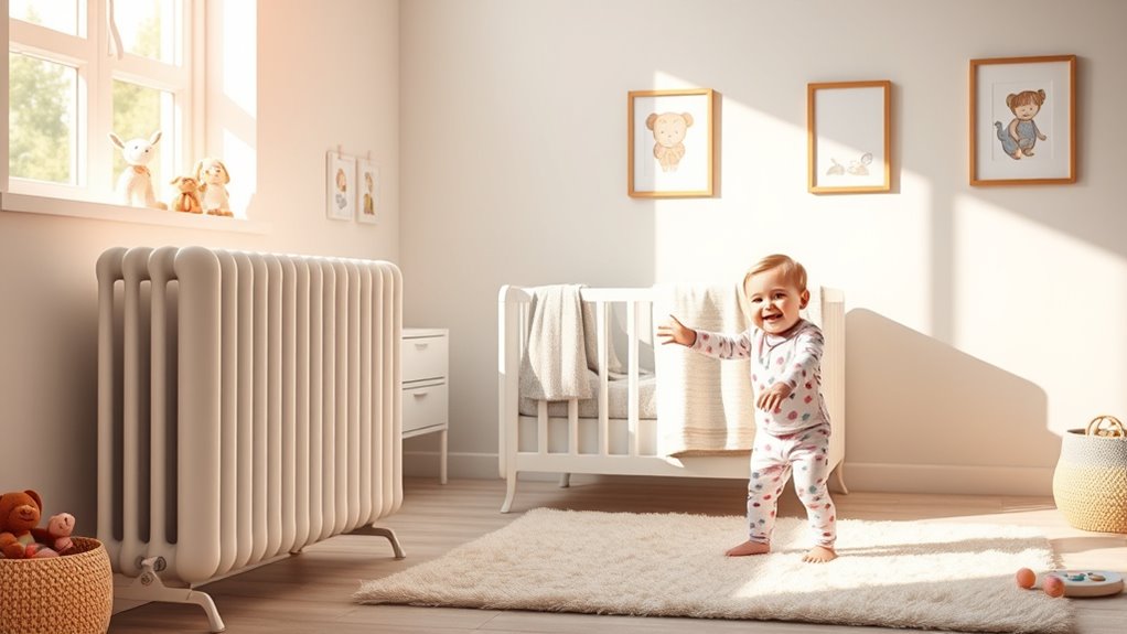 Because silence is essential in a nursery, I prioritize oil-filled radiators that operate quietly. These heaters are ideal because they lack fans or moving parts, resulting in noise levels typically below 5 decibels. Such quiet operation ensures minimal disturbance during sleep or play, creating a calm environment for the baby. The absence of fan noise prevents sudden loud sounds that could startle or wake infants, supporting better rest. When choosing an oil-filled radiator, I look for models explicitly rated as “silent” or “whisper-quiet,” guaranteeing the gentlest atmosphere possible. This focus on quietness helps maintain a peaceful nursery, promoting relaxation and uninterrupted sleep for my little one. Overall, low noise levels make these radiators a safe and serene heating option.