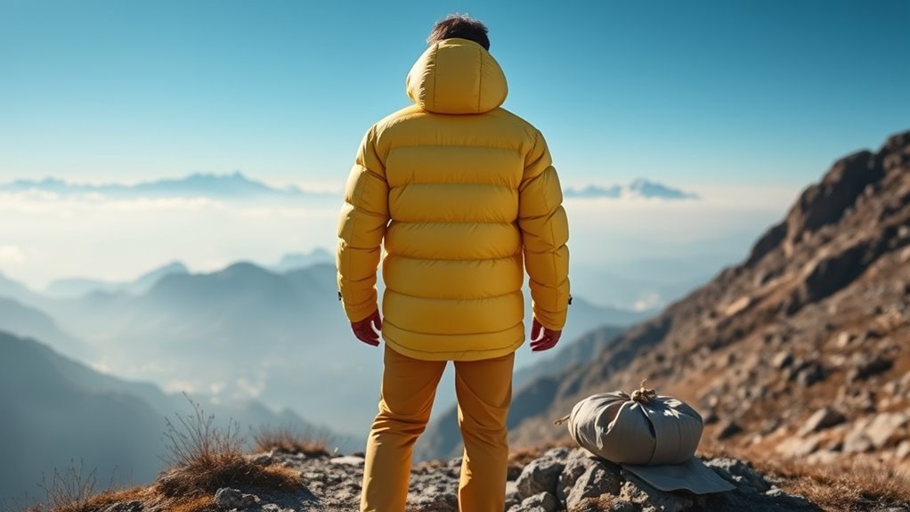 The key to choosing a packable lightweight down jacket lies in its insulation quality, which is primarily determined by fill power. Higher fill powers, like 700 or above, provide greater warmth relative to weight, making the jacket more efficient and easy to pack. Down insulation excels because it traps air, delivering superior warmth, but it can lose its insulating ability when wet. That’s why water-resistant shells are important for maintaining dryness and insulation effectiveness. The total warmth also depends on the amount of fill used; more fill generally means better heat retention. Additionally, well-designed quilting and even distribution of insulation prevent cold spots, ensuring consistent warmth. Balancing fill power, amount, and construction helps you find a jacket that’s both lightweight and reliably warm for your adventures.