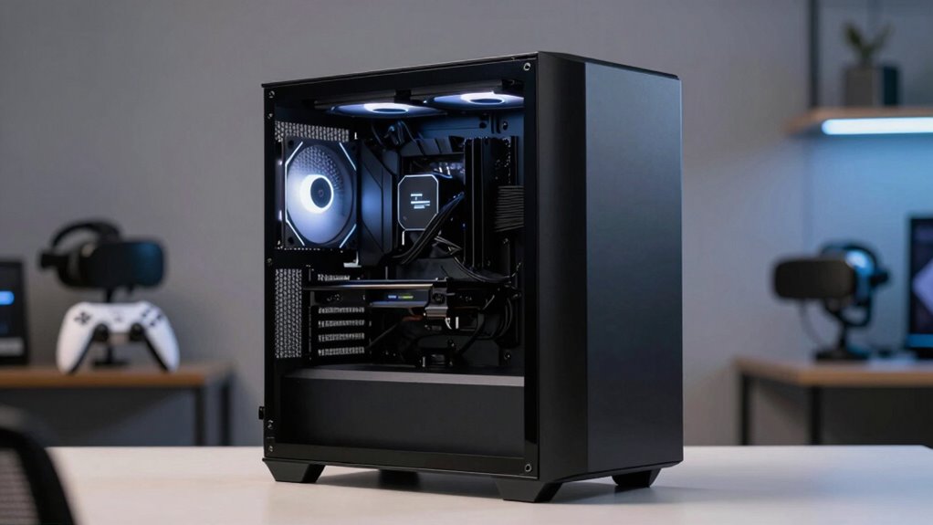 Aesthetic appeal plays a essential role in choosing a PC case for a quiet VR build, as it sets the tone and visual harmony of your setup. I look for sleek, minimalistic designs that blend seamlessly into any environment, but vibrant ARGB lighting can add a striking touch. Lighting customization is key; it allows me to sync colors with other components and create a cohesive theme. Transparent panels, like tempered glass or large windows, showcase internal hardware and lighting effects, elevating the overall look. Adjustable ARGB controls give me the freedom to personalize color schemes and add dynamic effects. The placement and brightness of internal lighting also influence how tidy and harmonious the setup appears, making aesthetics a crucial factor in my choice.