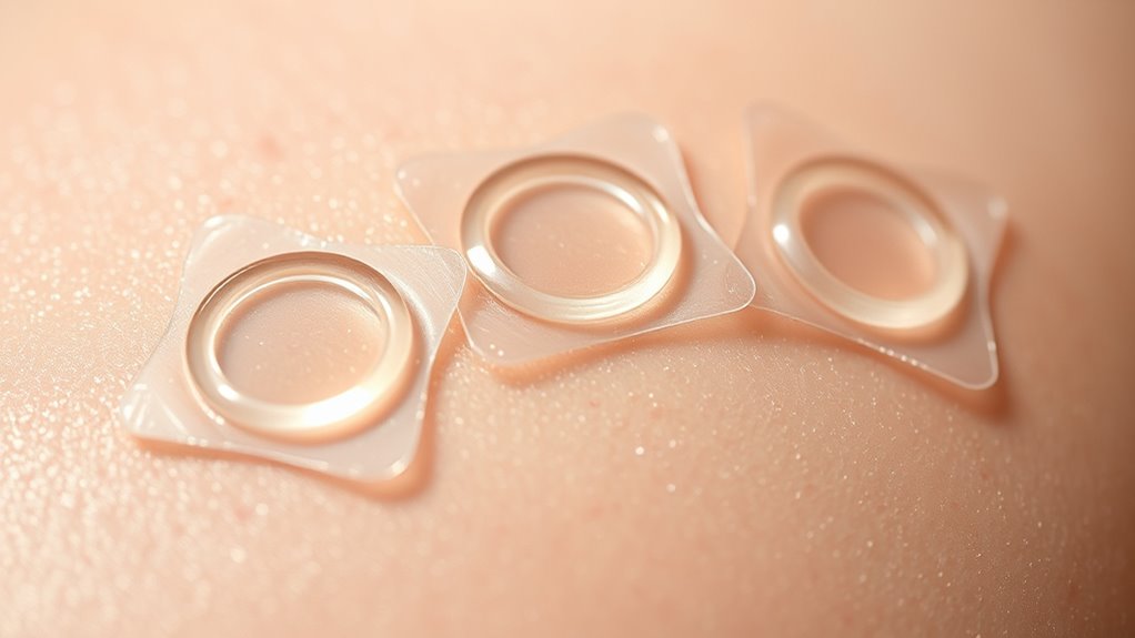 Since teens often want to keep their skincare discreet, selecting patches that blend seamlessly into the skin is vital. Thin, matte, and transparent patches help mask blemishes without drawing attention, making them a great choice for daytime wear. Properly contoured patches that fit the shape of the forehead or other facial areas stay in place better and prevent slipping during activities like talking or moving around. A snug fit is essential to guarantee the patch stays put and treats the blemish effectively. Additionally, lightweight designs enhance comfort, encouraging consistent use without feeling bulky or obvious. When choosing patches, look for options that are both discreet and well-fitting to boost confidence and maximize their effectiveness throughout the day.