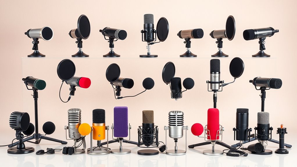 Including the right accessories and features in a podcast microphone bundle can make a significant difference in your recording experience. Essential accessories like microphone stands, pop filters, shock mounts, cables, and windshields guarantee you have everything needed for a professional setup. Look for bundles that offer features like built-in sound effects, voice changers, or customizable sound controls to boost creative flexibility. Multiple input options, such as XLR, USB, or 3.5mm jacks, provide compatibility with your current gear and room for future upgrades. User-friendly features like plug-and-play connectivity, adjustable controls, and clear manuals make setup straightforward. Additionally, consider whether the accessories support your intended use—whether it’s streaming, podcasting, singing, or gaming—to optimize performance for your specific needs.