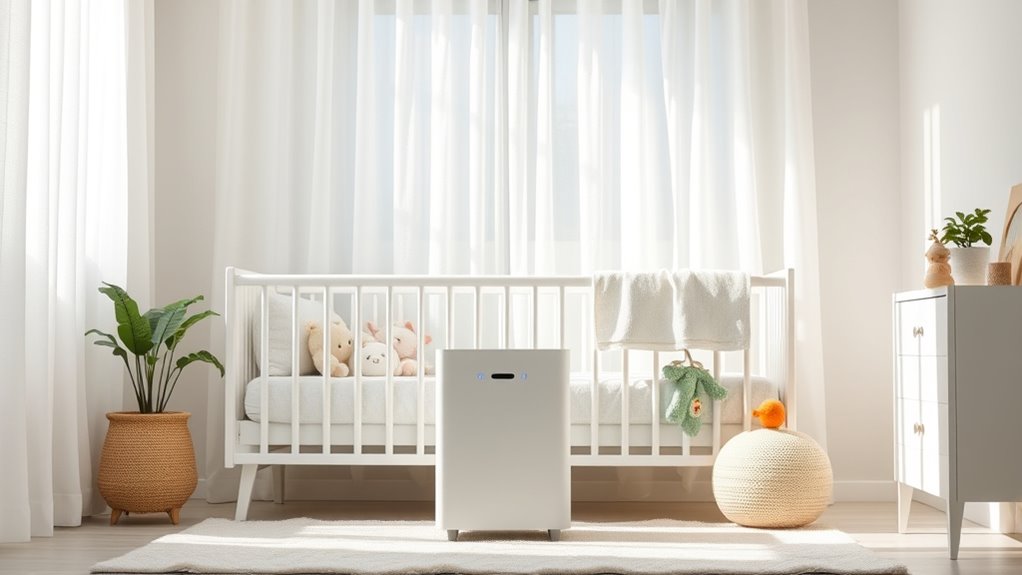 Ensuring your nursery remains a peaceful space means paying close attention to the noise levels of the air purifier you select. I recommend choosing models that operate at 24 dB or lower, so they won’t disturb your baby’s sleep. Look for units with sleep modes—these automatically reduce fan speed and noise, creating a quieter environment. It’s also important to verify that noise levels stay consistent across different fan speeds; sudden loud sounds can wake your baby. Be cautious of purifiers with noise above 30 dB, as they might cause discomfort or disrupt sleep. Additionally, consider devices with silent nightlight features, which won’t add any noise or disturbance. Prioritizing low noise levels ensures your nursery remains calm, cozy, and conducive to restful sleep.