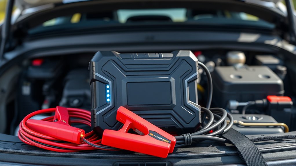 While size and weight are important, considering additional features can greatly enhance a portable jump starter’s usefulness. Many models double as power banks, with USB outputs to charge smartphones, tablets, and other devices, keeping you connected during emergencies. Built-in LED flashlights with SOS, strobe, and regular modes provide essential lighting in dark or roadside situations. Some jump starters include extra tools like air compressors, tire pressure gauges, or roadside emergency kits, making them versatile for various roadside needs. Devices with multiple ports and fast-charging capabilities allow you to charge several devices simultaneously, saving time. Advanced models also come with safety features such as reverse polarity protection and spark-proof clamps, ensuring safe operation and peace of mind when using these multi-functional tools.