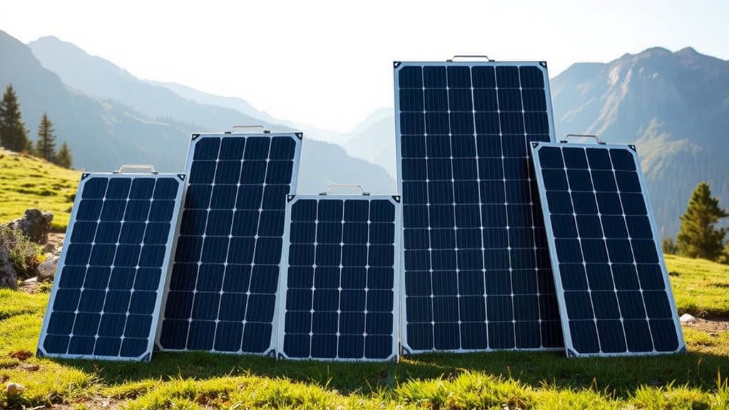 Portability and size are essential factors to take into account because they directly impact how easily I can transport and set up my solar panels. I look for lightweight designs under 10 pounds, making them simple to carry during camping trips. Smaller panels, typically around 100-150W, are ideal because their compact size fits easily into backpacks or storage cases. Foldable models often measure less than 20 inches when folded, which helps me manage space and convenience. Features like carrying handles, included storage cases, and quick setup mechanisms further simplify transportation and deployment. Whether I’m heading into the woods or setting up at home, choosing a panel that’s easy to carry and set up makes the entire experience more enjoyable and stress-free.