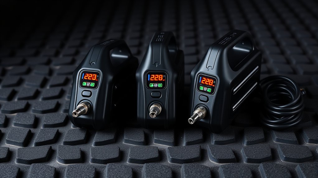 A portable 12V tire inflator’s battery life and overall portability are essential factors that can make or break its usefulness in real-world scenarios. A longer battery life means you can inflate multiple tires or devices without recharging, which is vital during roadside emergencies. Devices with high-capacity batteries, like 5400mAh or more, allow for several inflations before needing a recharge. Rechargeable batteries reduce dependence on power outlets, making outdoor or remote use more convenient. Additionally, a compact, lightweight design enhances portability, letting you carry the inflator easily in your vehicle or backpack. Some models feature dual power options, combining rechargeable batteries with 12V DC connections, extending usability across different situations. These features guarantee you’re prepared, no matter where or when you need rapid tire inflation.