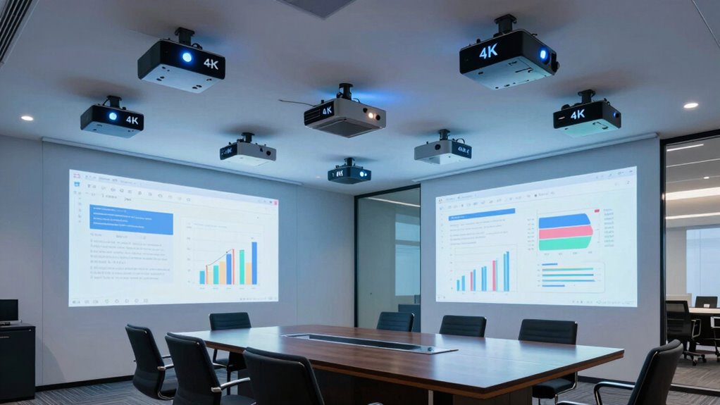 To guarantee your conference room projector performs ideally in various lighting conditions, you need to take into account its environmental compatibility. First, ensure the projector’s brightness (measured in lumens) is high enough to combat ambient light, providing clear visibility even in well-lit rooms. Check for color accuracy and support for a wide color gamut to maintain vivid, true-to-life images regardless of lighting conditions. Look for features like automatic wall color correction and ambient light sensors that adapt image quality instantly, optimizing visuals without manual adjustments. Compatibility with room lighting controls is also vital for seamless brightness and contrast adjustments during presentations. Lastly, consider noise levels and cooling systems to prevent distractions in quiet conference settings, guaranteeing a smooth and professional experience.