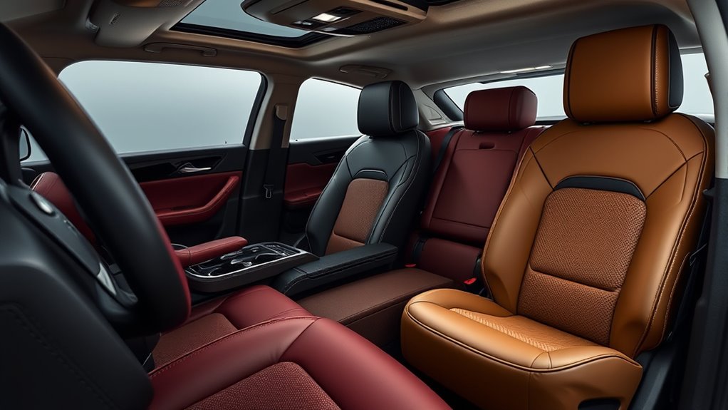 Choosing the right material for your premium car seat covers is vital because it directly affects both durability and comfort. High-quality options like genuine leather, Nappa leather, or premium microfiber offer a luxurious feel and stand up well to daily wear. Breathable fabrics such as mesh or air-cool meshes improve airflow, reducing heat buildup during long drives and keeping you comfortable. Memory foam padding contours to your body, providing pressure relief and long-term support. Waterproof and stain-resistant surfaces protect your seats from spills and stains, extending their lifespan. Additionally, it’s essential to ensure the material is compatible with your vehicle’s safety features, like airbags and seatbelts, so protection isn’t compromised. The right fabric choice makes a noticeable difference in your driving experience.
