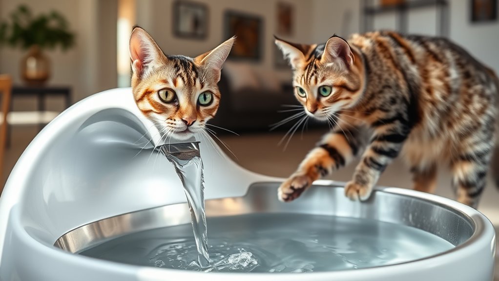 Pet attraction features play a crucial role in encouraging cats to use their drinking fountains regularly. I look for fountains with flowing water features like streams or waterfalls, as they mimic natural sources cats prefer. Adjustable streams and multiple flow modes keep hydration interesting, prompting cats to drink more by offering variety. Visual cues such as LED lights or transparent water levels make it easier for cats to spot and monitor their water, encouraging consistent drinking habits. Designs that resemble toys or incorporate gentle movement attract even picky cats, keeping them engaged. Features like bubbling water or flowing streams leverage a cat’s natural curiosity, making the fountain more appealing. These thoughtful details help ensure your feline stays well-hydrated and happy.