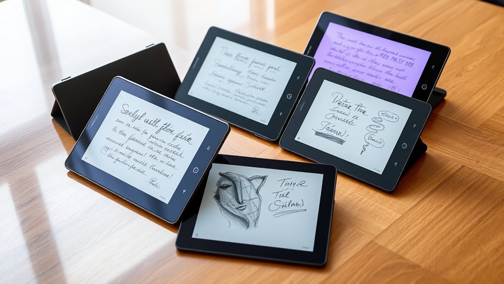 Think of screen refresh rates like the heartbeat of your device—faster beats mean smoother writing. Higher refresh rates make writing feel more responsive, almost like you’re writing on paper, while lower rates can cause lag and choppiness. I’ve found that a higher refresh rate enhances the note-taking experience, making it more natural and fluid. So, if you want seamless writing, look for tablets with faster refresh rates.