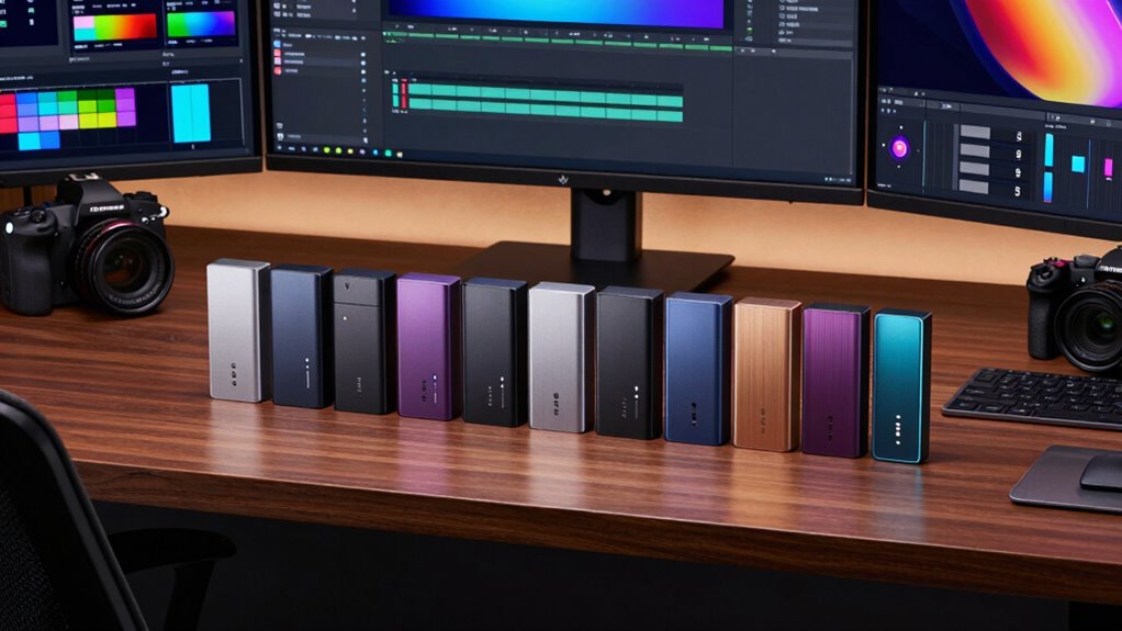 Think of rugged external SSDs as the knights of the storage world. Their durability features include shock resistance, often rated with MIL-STD-810G standards, meaning they can withstand drops and impacts. Water and dust resistance, usually IP68 rated, shield against environmental hazards. Additionally, reinforced casings and rubber bumpers absorb shocks. These features guarantee your data stays safe, no matter where your creative journey takes you.