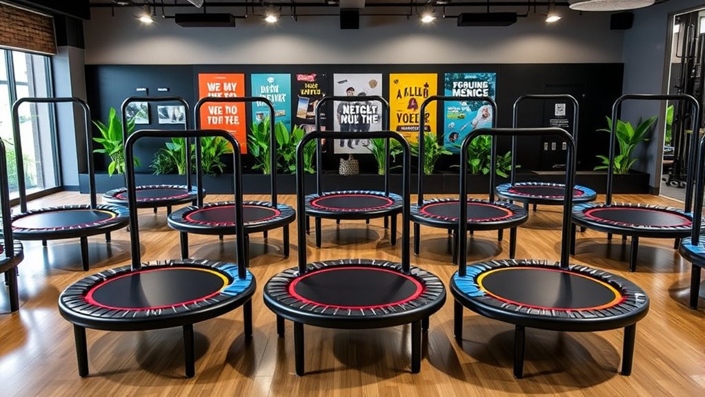Choosing a fitness trampoline set also means considering how much noise and impact it produces during workouts. High-quality mini trampolines with bungee cords produce about 95% less noise than traditional spring models, making for a much quieter workout. Bungee-based trampolines offer a softer, low-impact bounce that reduces stress on your joints and minimizes impact-related noise. Using thickened, high-elasticity bungees—like those 1.2 mm or thicker—improves shock absorption, further lowering noise levels. These elastic systems create considerably lower impact forces, making them ideal for noise-sensitive environments such as apartments or shared spaces. Plus, well-designed trampolines with elastic cords can support high loads—up to 550 pounds—while maintaining a quiet, gentle bounce.
