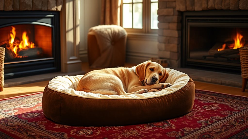 To guarantee my pet stays comfortable and safe in a heated bed, I pay close attention to its size and fit. I make sure the bed’s dimensions match my pet’s size, giving enough room for them to stretch or curl up comfortably. I also check the bed’s weight and volume to ensure it fits well in my indoor space without overcrowding. For older or arthritic pets, I opt for larger sizes that offer extra room for movement. The shape and design matter, too—donut or nest styles should suit my pet’s sleeping habits and preferred positions. Finally, I verify the size specifications against my pet’s breed and weight to prevent discomfort or restricted movement, ensuring a cozy, safe resting spot.