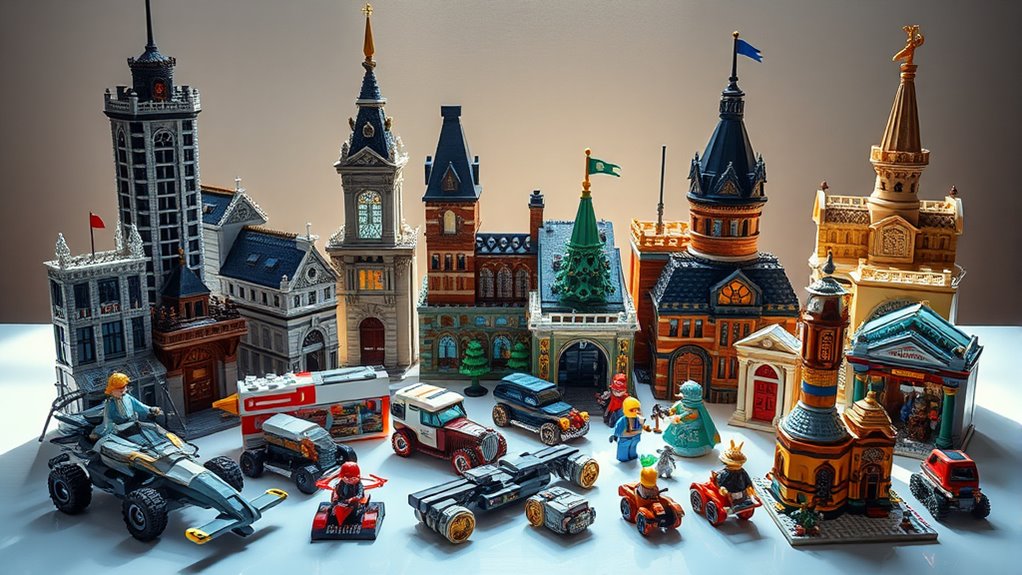 When picking out a premium LEGO set to add to your collection, considering its theme and genre can make all the difference in its long-term appeal. Choosing a theme that aligns with your personal interests, like Star Wars or Harry Potter, can increase your connection and the set’s value over time. Think about the genre—whether you prefer intricate display models, interactive play sets, or a mix of both—so it matches how you want to enjoy it. Relevance matters too; selecting themes that are trending or nostalgic ensures the set stays meaningful and desirable. Iconic characters, landmarks, or scenes within the genre also boost the set’s appeal, making it a standout piece in your collection.