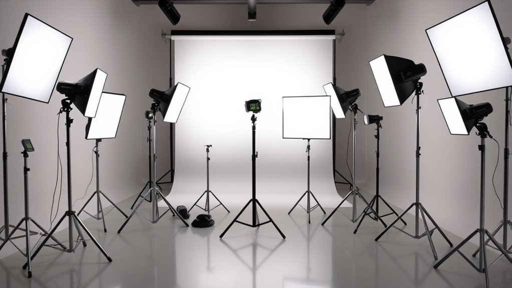 Perfectly poised, I prefer a simple, versatile setup for small studios. I start with soft, diffused key lights to create gentle, flattering illumination. Fill lights balance shadows without overpowering, and backlights add depth. I also use adjustable stands for flexibility and reflectors to bounce light where needed. This tidy, tailored approach guarantees professional-quality photos without clutter, making every shot shine brightly with beautifully balanced light.