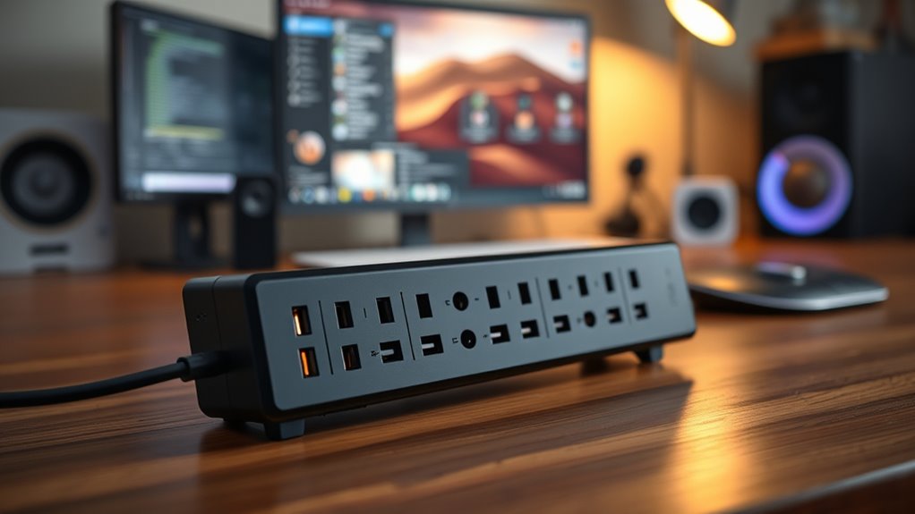 Wider outlet spacing, usually at least 2 inches, makes it easier to connect large plug adapters and prevents blocking neighboring outlets. This spacing is vital if you have bulky chargers or transformers, as it keeps everything accessible without crowding. Adjustable or rotating outlets are also beneficial; they help organize cords by accommodating different plug sizes and orientations, reducing clutter. The size and shape of the surge protector matter too—compact designs with closely spaced outlets can limit device connections and restrict larger plugs. Proper outlet spacing not only improves accessibility but also promotes better airflow, helping to keep the surge protector and connected devices cooler. This ultimately extends their lifespan and maintains safe operation, making it a key factor when choosing premium surge protectors.