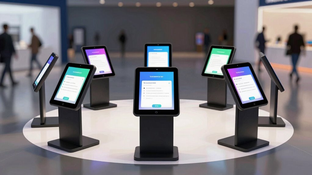 When choosing a premium tablet kiosk stand for event lead capture, I consider several key factors to guarantee it meets my needs. Compatibility with my devices, security features, and how adjustable or portable the stand is play vital roles. By focusing on these points, I can find a stand that’s reliable, easy to set up, and perfect for various event environments.