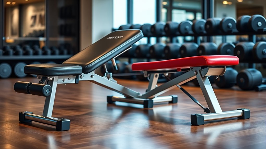 Maximizing space efficiency is essential when selecting a premium weight bench, especially if you have limited room for strength training. Foldable benches are a game-changer, allowing quick storage under beds or against walls, freeing up precious space. Compact designs with slim profiles and minimal footprints help you integrate strength training even in small areas. Multi-position benches with adjustable components offer versatility without needing extra equipment, making the most of your space. Lightweight yet sturdy construction ensures easy transportation and setup without sacrificing stability. Some benches feature foldable frames and integrated wheels, making stowing and repositioning effortless. Prioritizing space efficiency means you can enjoy a thorough workout routine without cluttering your environment or sacrificing comfort.