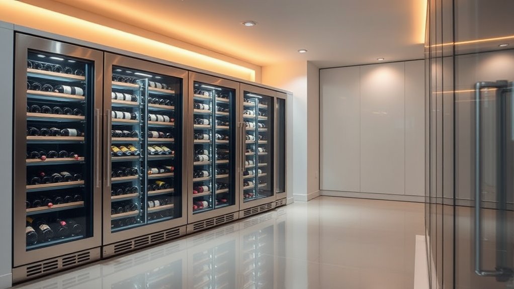 A well-built wine refrigerator not only protects your collection from environmental factors but also needs effective security measures to keep your valuable wines safe. Many premium units feature lockable doors or security locks, preventing unauthorized access. Some models go further with digital or key locks, adding an extra layer of protection. High-end refrigerators often incorporate secure access controls like password-protected digital panels or biometric systems, ensuring only trusted individuals can open them. These security features are especially important for rare or expensive wines, guarding against theft or tampering. Proper security measures help maintain the integrity of your collection and give you peace of mind. When choosing a refrigerator, consider these security options carefully to ensure your wines are both perfectly stored and safely protected.