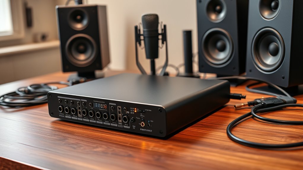 Choosing the right preamps and inputs is essential because they directly influence the clarity and fidelity of your recordings. High-quality preamps ensure your sound is detailed, with minimal noise and distortion, which is crucial for professional results. The number and type of inputs—like XLR, TRS, or Hi-Z—determine how many sources you can record simultaneously and the versatility you have. Preamps with higher gain and better headroom provide more dynamic range, reducing the risk of clipping during loud recordings. Additionally, features like phantom power are vital for condenser microphones, guaranteeing they receive enough power for ideal performance. Overall, the quality of inputs and preamps plays a significant role in achieving crystal-clear sound and professional-grade recordings.