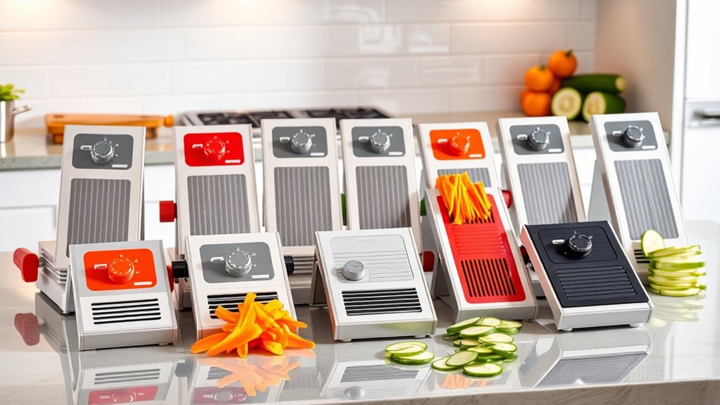 Did you know that over 30% of kitchen accidents involve cutting tools? Top mandoline slicers include safety features like adjustable blade guards, non-slip bases, and hand guards to protect your fingers. I always look for models with these safety elements—trust me, they make meal prep safer and more comfortable. With these features, you can focus on slicing precisely without worrying about slips or cuts.