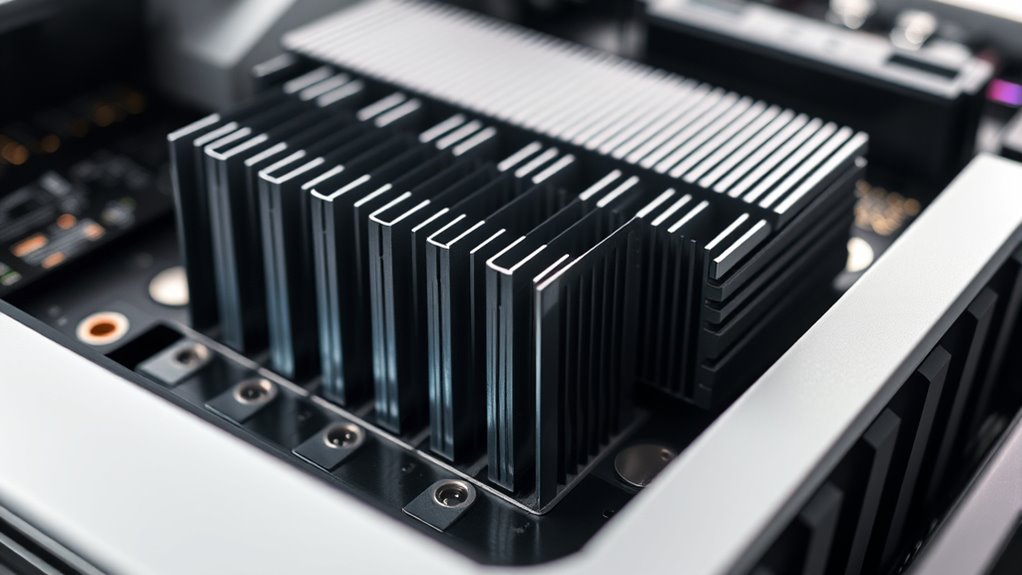 The cooling performance of a PS5 SSD heatsink depends largely on how well it can lower temperatures during intense workloads. A good heatsink should reduce SSD temperatures by at least 10°C to 30°C to prevent thermal throttling and extend lifespan. Materials like aluminum and copper with high thermal conductivity are essential for efficient heat transfer away from the drive. Ensuring proper contact between the heatsink’s thermal pad and the SSD chip maximizes heat dissipation. Larger surface areas and airflow channels also improve cooling, preventing overheating during demanding tasks. Ultimately, a heatsink’s ability to maintain lower operating temperatures directly influences sustained performance and durability of your SSD in gaming or professional use. Prioritizing these factors guarantees you get the best cooling effectiveness.