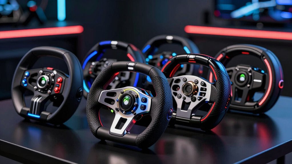 Pedal precision and feel play a vital role in delivering an authentic racing experience on Xbox, as they directly influence your control and responsiveness. High-quality pedals offer adjustable tension and pedal travel, allowing you to customize the feel to match your preferences. Using sensors like Hall effect or load cells boosts pedal accuracy and durability, ensuring consistent performance over time. Realistic pedal feel also includes anti-slip surfaces and feedback mechanisms that simulate road conditions, enhancing immersion. Proper calibration is essential for maintaining accuracy and ensuring your inputs translate precisely during gameplay. When selecting a racing wheel, pay attention to these factors, as they substantially impact your ability to execute precise maneuvers and enjoy a realistic, satisfying racing experience.
