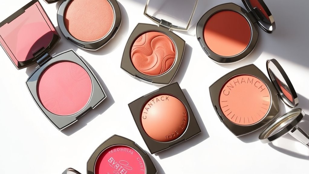 Long-lasting blushes rely on high-pigment formulas that stay vibrant throughout the day, often enduring 8 hours or more. To achieve this, look for water- and sweat-proof formulations that resist fading, smudging, or patchiness, even during active days. Matte or semi-matte finishes tend to stay put longer compared to dewy or glossy textures, which can fade faster with moisture. Ingredients like film-forming agents and silicone-based compounds boost durability, helping the blush cling to your skin all day. Proper application techniques also matter—using a primer or setting with translucent powder can extend wear time considerably. When choosing dupes, prioritize those with these long-lasting features to ensure your blush stays fresh without constant touch-ups.