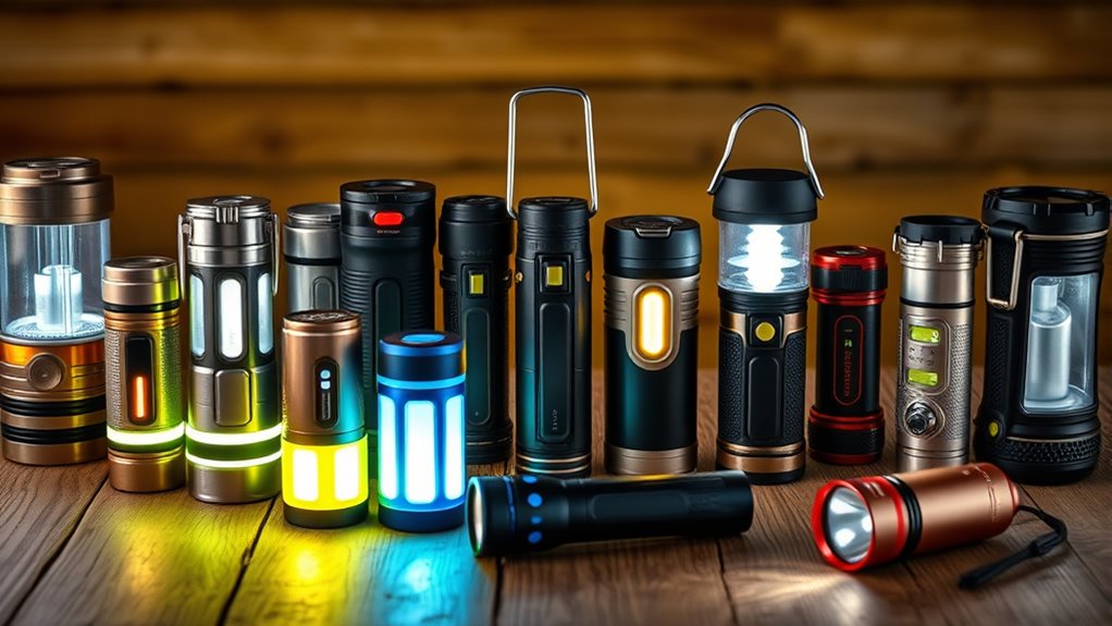 If you’re looking for the best rechargeable lanterns and flashlights, I recommend options that combine high brightness, durable designs, and eco-friendly power sources like USB-C, solar, or batteries. Many models offer adjustable modes, long runtimes, and built-in power banks for charging devices. These versatile lights are perfect for camping, emergencies, or outdoor adventures. Keep exploring to find detailed reviews and features of the top 15 options that fit your needs.