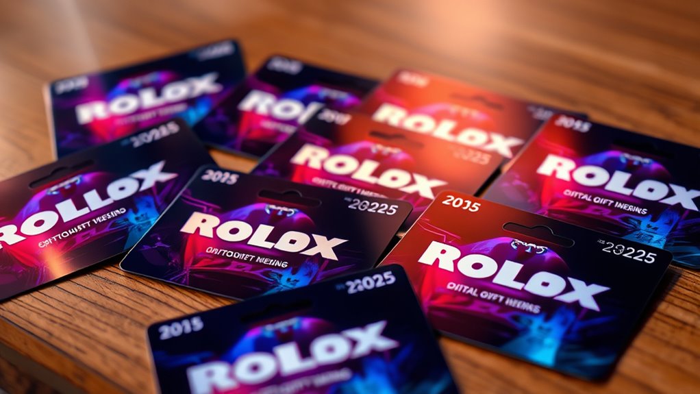 Choosing the right gift card value is crucial because it directly influences how much Robux or credits the recipient can access, affecting their ability to customize avatars and unlock exclusive items. A higher-value gift card provides more Robux, offering greater flexibility for personalization and exclusive content. When selecting a card, consider the recipient’s gaming habits—whether they prefer casual spending or more extensive content creation. Some denominations include bonus Robux or virtual items, increasing overall value. It’s also important to match the gift card’s value with your intended purpose, whether for occasional use or supporting ongoing game development. By choosing an appropriate amount, you guarantee the gift meets their needs and enhances their Roblox experience without overspending.