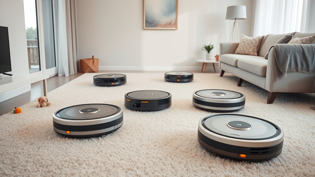 When selecting a robot vacuum, it’s important to contemplate how well it handles different floor types in your home. Look for models with adjustable suction power or modes tailored to carpets, hardwood, tiles, or rugs. Some vacuums even support mopping functions, ideal for hard surfaces like tile and hardwood. Make sure the device is compatible with your carpet type—low-pile or medium-pile—since some vacuums work only on hard floors. Check if its brushes and cleaning heads can effectively pick up debris without damaging delicate surfaces or losing efficiency. Additionally, sensors that adapt cleaning intensity based on the floor type can boost performance and prevent damage. Matching your vacuum’s features to your floors ensures thorough cleaning and longer device lifespan.