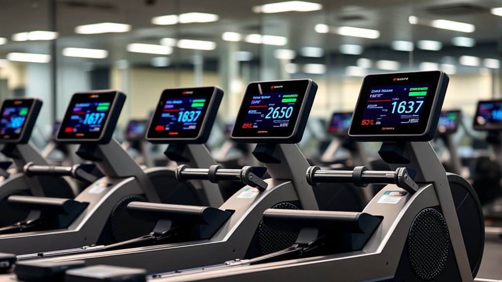 Tracking your workout data is essential for staying motivated and measuring progress effectively. Many rowing machines come equipped with digital displays or monitors that show real-time metrics like distance, time, calories burned, and stroke count. Bluetooth connectivity is a game-changer, letting you sync data with smartphones or fitness apps for detailed analysis and goal setting. Some models even support app integration, providing personalized training programs and tracking your performance history. Reliable data tracking keeps you accountable by clearly showing your improvements over time, making it easier to stay committed to your fitness journey. When choosing a rowing machine, consider how well its tracking features align with your goals and whether it offers the connectivity options you prefer for seamless data management.
