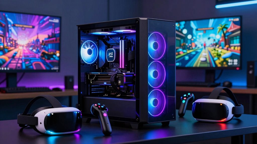 When investing in an RTX graphics card for VR, it’s important to contemplate how well it will hold up with future technology advancements. Supporting the latest PCIe standards like PCIe 5.0 guarantees compatibility with upcoming motherboards and faster data transfer speeds. Advanced AI features such as DLSS 4 can boost graphics quality and performance, keeping your system relevant as VR applications become more demanding. High VR resolution support, up to 8K and beyond, ensures the GPU can handle future high-fidelity headsets and displays. Incorporating the latest RT and Tensor Cores allows efficient management of real-time ray tracing and AI workloads. Finally, ample VRAM—12GB or more—provides the necessary headroom for future VR titles with increasing graphical complexity.