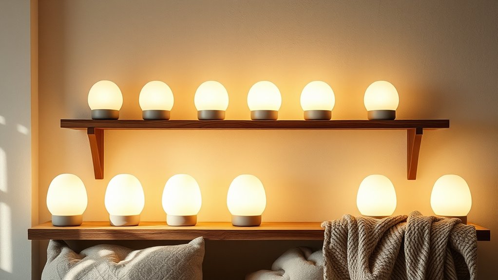 When choosing a sad lamp for winter blues, I consider the brightness levels and whether they match my needs. I also look at adjustable color temperatures, timers, and auto shut-off features to make therapy sessions more convenient. Finally, I pay attention to the lamp’s design, size, and light quality to guarantee it’s safe and effective for daily use.