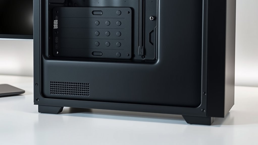 Choosing a silent PC case with sound damping requires guaranteeing it supports effective airflow without compromising noise reduction. I look for cases with compatible fan mounting options, such as multiple fan slots or high airflow panels, to maintain good ventilation. It’s also important that the case can accommodate radiators or large cooling components without blocking airflow paths. I verify that sound-damping materials don’t markedly hinder ventilation or restrict airflow channels. Adjustable panels or removable filters are a bonus, as they allow me to balance quiet operation and cooling when needed. Additionally, I consider the case’s internal layout to ensure proper cable management. This prevents airflow blockages, helping me keep my build quiet and cool without sacrificing performance.