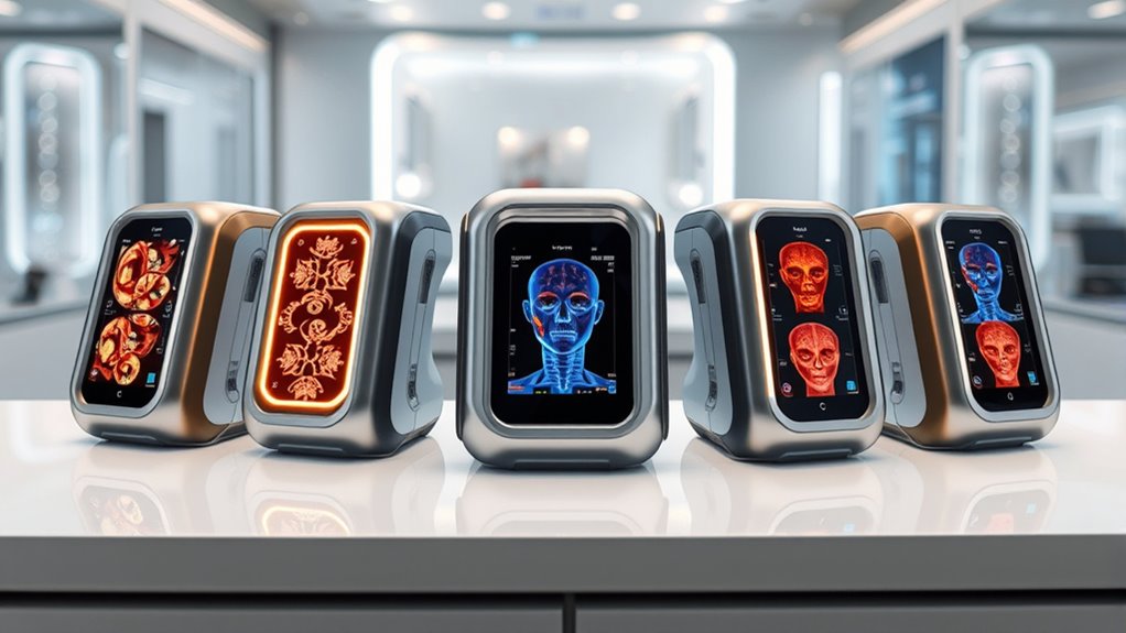 If you’re curious about the top skin analysis devices in 2025, I recommend considering options that combine advanced imaging like 38MP HD cameras, spectral analysis for detailed skin insights, and AI algorithms for accuracy. Look for user-friendly interfaces, secure data storage, and multilingual support to suit diverse needs. These features guarantee precise, reliable assessments. Keep exploring to discover more about these cutting-edge tools that can help you achieve flawless skin results.