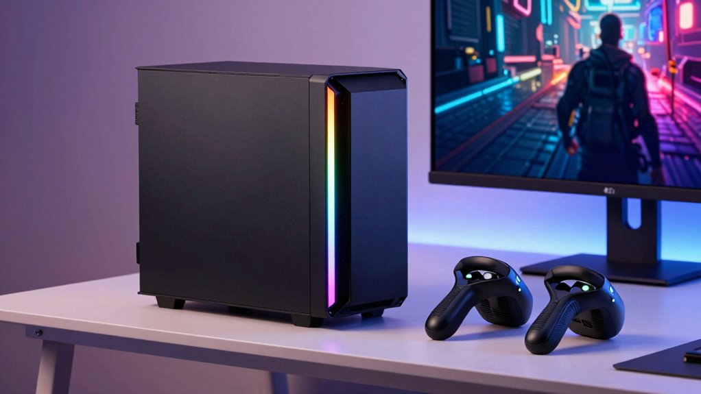 Optimizing performance in a small form factor VR gaming PC also means paying close attention to its design features. A compact case, typically 8.1L or smaller, balances size with performance, making portability easier without sacrificing power. Perforated panels are essential, allowing airflow to keep components cool in tight spaces. Features like leather handles or lightweight metal construction enhance portability, making it simple to transport and set up. Inside, components are carefully chosen to fit a small footprint, often using mini ITX motherboards and low-profile cooling solutions. Connectivity is also indispensable; multiple USB ports and outputs like HDMI and DisplayPort support dual 4K or 8K displays and VR headsets. These design elements ensure a sleek, efficient, and portable VR gaming experience.