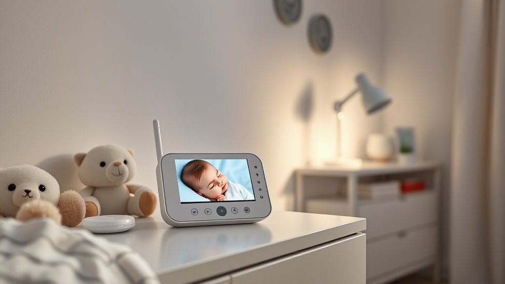 Choosing a smart baby monitor that’s easy to use can make all the difference in your daily routine. A straightforward setup with minimal steps helps you get started quickly and hassle-free. Intuitive controls, like touchscreens or simple app interfaces, make it easy to adjust settings or view live footage without frustration. Clear, real-time notifications ensure you stay informed and can respond promptly, without browsing complicated menus. Compatibility with smartphones and tablets allows you to monitor your baby from devices you already use daily. User-friendly features like one-touch camera controls and preset modes further simplify operation, saving time and reducing confusion. Ultimately, a monitor that’s easy to operate lets you focus on what truly matters—your baby’s safety and your peace of mind.