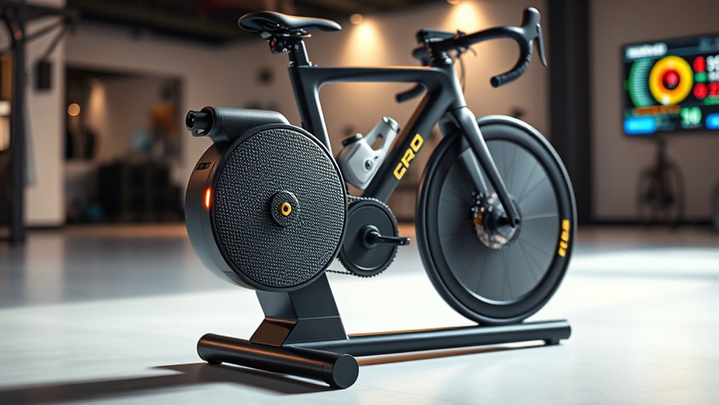 Have you ever noticed how some smart bike trainers make almost no noise while others produce loud, distracting sounds? The type of resistance mechanism plays a big role—magnetic trainers are typically quieter than hydraulic or mechanical ones. Stability is equally important; a sturdy base with adjustable anti-slip feet can prevent wobbling during intense rides. Proper leveling, using front wheel risers or adjustable feet, reduces vibrations and noise. Poorly mounted bikes or incompatible tires, like knobby or off-road types, can increase friction and sound, making your workout less enjoyable. A well-designed trainer with a low center of gravity and wide footprint minimizes wobbling, providing safer, more comfortable rides. Prioritizing noise and stability ensures a smooth, quiet experience that keeps you focused and motivated.