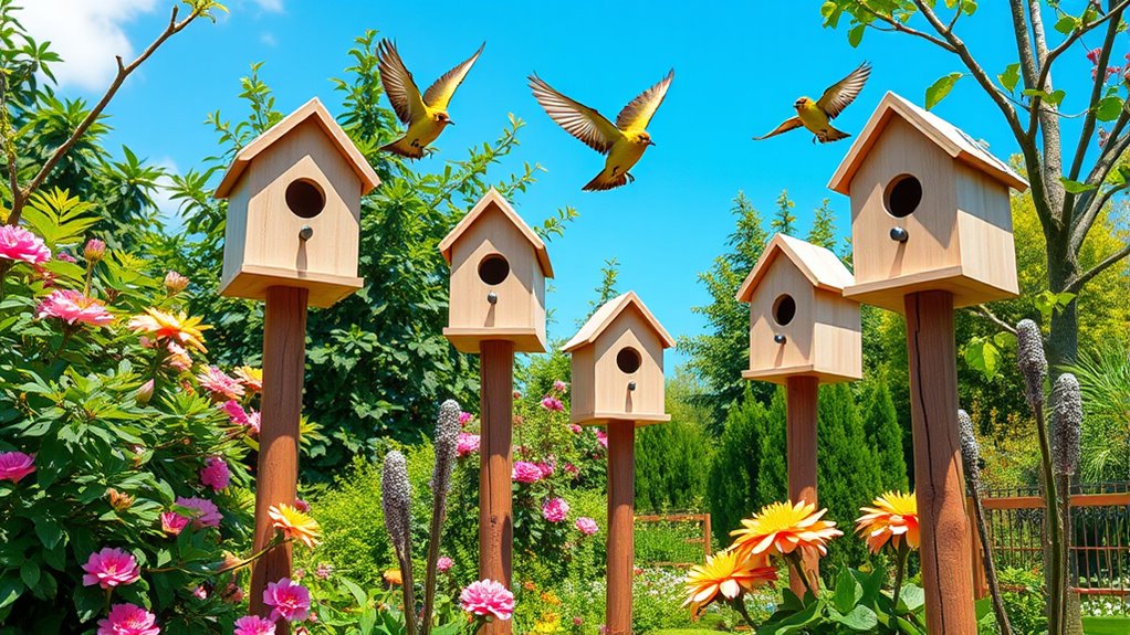 Smart bird houses prevent predators by featuring secure entry points that are just the right size for birds, making it hard for larger animals to get in. I also love their predator-proof designs, like sloped roofs or borthers that deter climbing predators. Some models include cameras or sensors that alert me if there’s a threat. These safety features give my feathered friends a safe place to nest, worry-free.