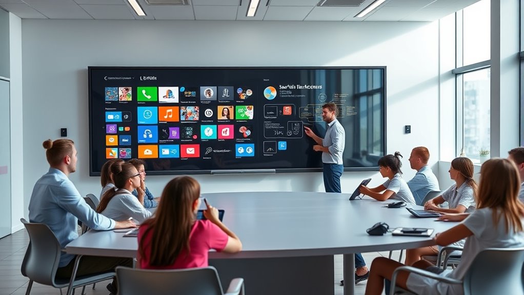 To get the most out of a smart blackboard system, it’s essential to guarantee it can connect seamlessly with a variety of devices and platforms. I look for systems supporting multiple connection options like Wi-Fi, Bluetooth, and wired ports such as HDMI, USB, or Type-C, ensuring smooth integration with existing equipment. Compatibility across operating systems—Android, Windows, iOS, and Linux—is indispensable to accommodate diverse user devices. Wireless screen sharing features like Miracast, AirPlay, or proprietary solutions make content sharing effortless from multiple devices simultaneously. Additionally, I verify if the system integrates with popular conferencing platforms like Zoom, Microsoft Teams, or Webex for remote learning. Open app ecosystems and cloud storage options are also essential for flexible app downloads, data sharing, and remote access across devices.